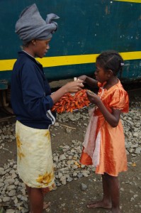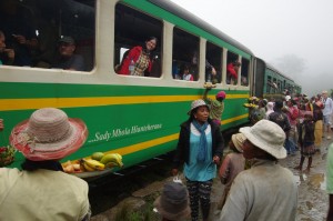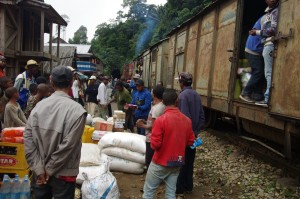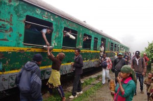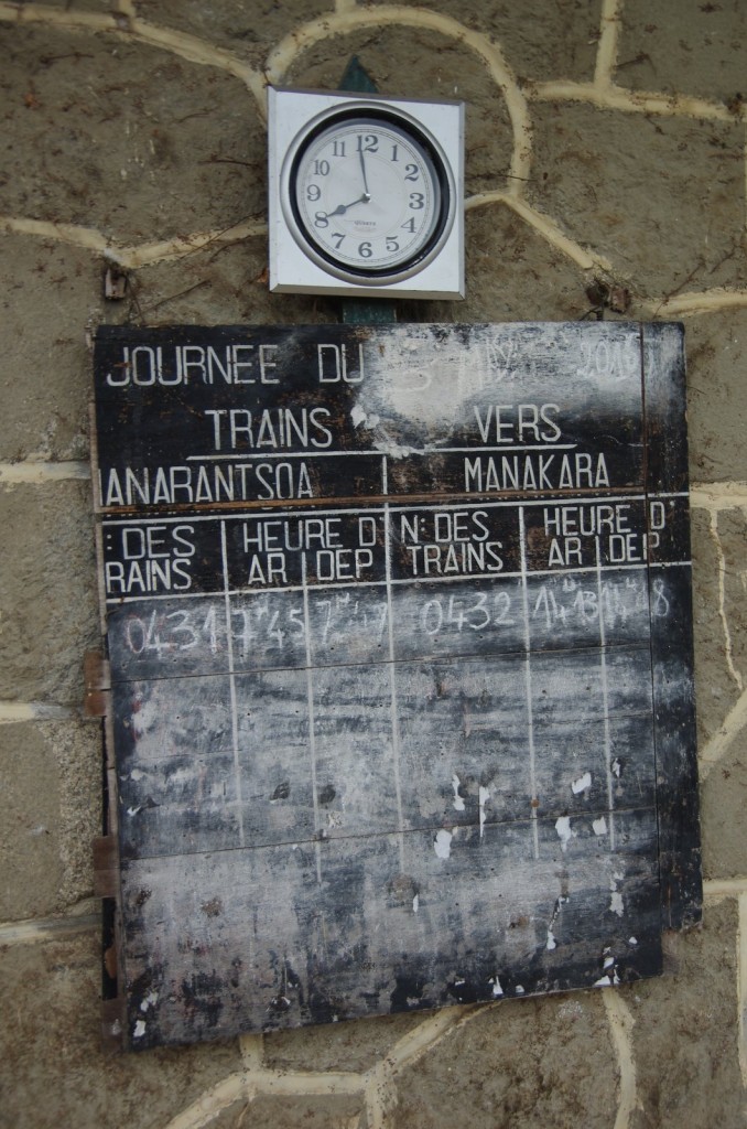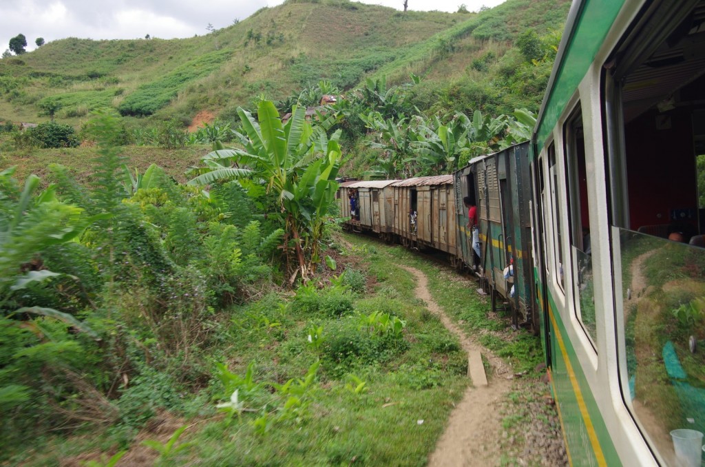Journée ferroviaire, à bord du train FCE qui relie Fianarantsoa à Manakara, sur la côte Est. Le tortillard, qui date de 1936 (tout est d’époque… y compris les rails), relie de nombreux villages, auxquels il est le seul moyen d’accès. De nombreux et interminables arrêts permettent chargement et déchargement de fret de toute nature (TV Led dans un bras, casier de poules dans l’autre).