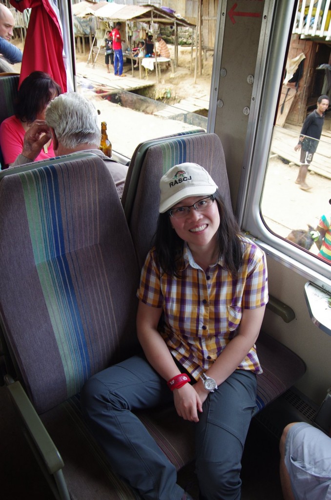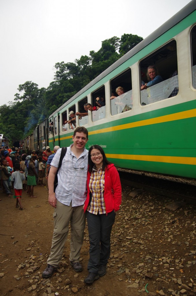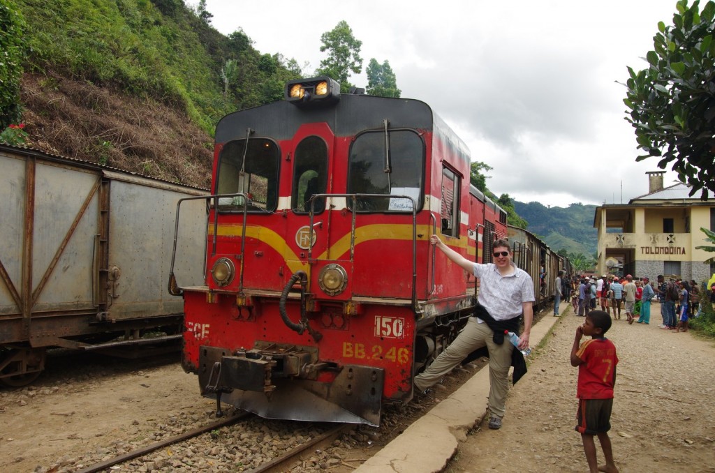 L’expérience fût néanmoins un peu rude, les 10 heures annoncées se transformant en plus de 15, avec une arrivée en pleine nuit. Et surtout, à l’autre extrémité du wagon, un groupe de bidochons, fraîchement débarqués de la Réunion et largement imbibés, beuglant des chansons paillardes ont mis nos nerfs à rude épreuve !今天是火车日,因为我们要乘坐著名的FCE线(连接Fianarantsoa和东海岸的Manakara)。这条火车的历史可以追溯到1936年(这里所有的一切都是很古老的。。。连铁轨也是那个年代的),它连接很多村庄,铁路基本是到达这些地方的唯一交通方式。火车每站都停很长很长的时间,铁路工作人员利用这段时间装卸各式各类的货物(在车站,经常能看到有人左手夹着液晶电视,右手拿着鸡笼)。